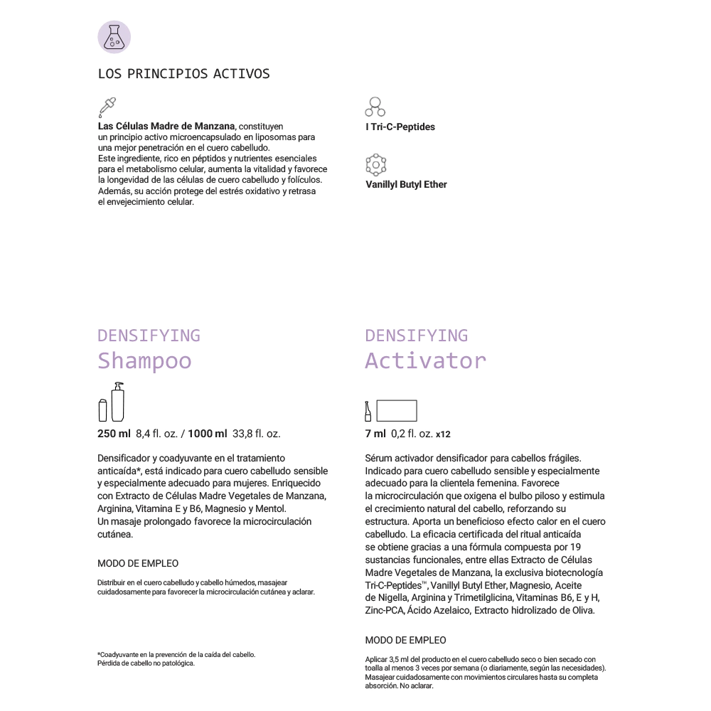 Densificante y coadyuvante en el tratamiento contra caídas*, está indicado para la piel sensible y especialmente adecuado para la mujer. Enriquecido con extracto de células madre vegetales de manzana, arginina, vitamina E y B6, magnesio y mentol. Un masaje prolongado favorece la microcirculación cutánea.